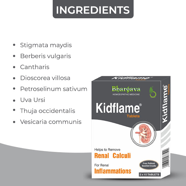 Doctor Bhargava Kidflame Tablet is a highly effective homeopathic formula specifically designed to manage conditions related to renal colic, renal calculi, urinary tract infections, nephritis, cystitis, and urinary incontinence.